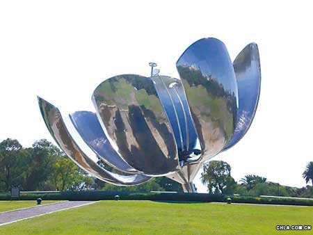 這朵由鋁和鋼制成的巨型花重達18噸,由6片高達20米的花瓣組成。最為獨特的是,這是一座太陽能活動雕塑,由計算機控制的液壓設備在每天日出時將花瓣打開,日落時又將它們閉合。開閉時間根據日照時間長短而不同,由電子計時器依日歷提前確定。花瓣的開合程度以及花朵朝向還可隨著陽光而改變。每逢阿根廷國慶日、獨立日、國旗日等重大節日,這朵金屬巨花便保持24小時綻放。雕塑底座建立在直徑44米的水池中央,四周有綠茵茵的草坪環繞。在陽光照射下,金屬花瓣上倒映著粼粼波光,格外壯觀。當外部風速超過每小時80公里時,金屬花就自動閉合,以保護安全。
