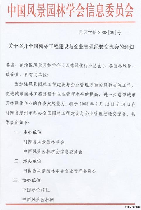 為加強風景園林工程建設與企業(yè)管理方面的經(jīng)驗交流工作,促進城市園林工程建設和企業(yè)管理水平的提高,進一步增強城市園林綠化企業(yè)的自我發(fā)展能力。特于2008年7月12日至14日在河南省鄭州市舉辦全國園林工程建設與企業(yè)管理經(jīng)驗交流會。具體事宜如下: