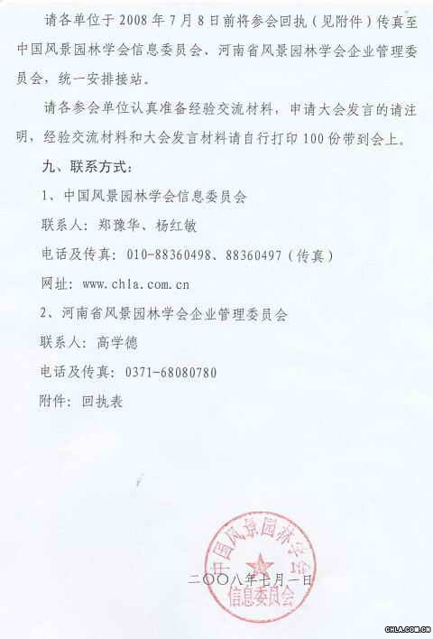請各單位于2008年7月8日前將參會回執(zhí)(見附件)傳真至中國風景園林學會信息委員會、河南省風景園林學會企業(yè)管理委員會,統(tǒng)一安排接站。