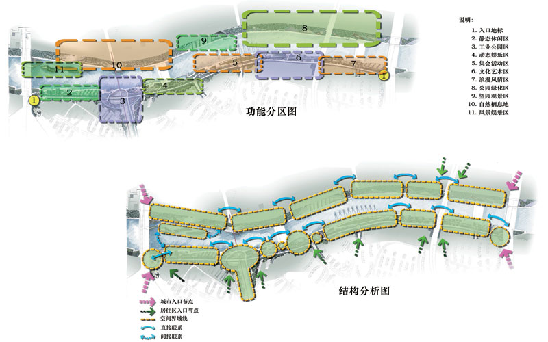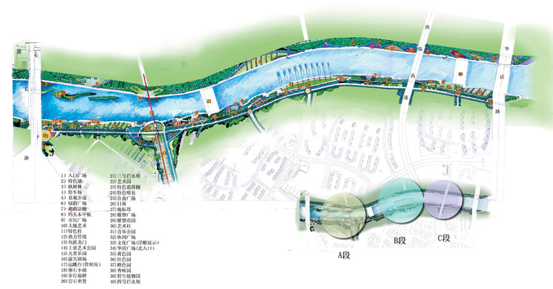 總體設計說明:本設計秉承生態、自然、可持續發展的理念,對傳統與現代、工業與景觀、景觀與歷史文化、景觀與地域特色等進行了積極的探索。在河堤斷面上,充分考慮了相關技術規范,使其在滿足防洪要求的前提下,景觀化、藝術化;在景觀結構上,與第一國際城住區規劃相整合,努力做到城市景觀建設與經營城市理念的雙贏;重點強調文化傳承與地域特色,在景觀設計與植栽設計上進行了調整;重新推敲景點細節,在帶狀景觀帶中有節奏地營運景觀高潮點。
