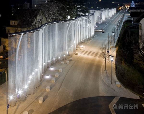 即使是在大街的對面,也設置了這種銀色的外墻,與施華洛世奇水晶世界連為一體,營造出公共空間的流動過度性。“面紗”、景觀、照明和空間設計集合在一起,形成一種令人窒息的美妙風景。該外墻選用抗腐蝕、抗風化的網孔不銹鋼這一新型材料,用10米高的鋼柱支撐而構成,光照在上面形成有多種不同的反射效果。一組霓虹燈照亮了旁邊的石凳,形成第二道分界線。白天,太陽光線投過天空厚厚的云層照射在這個“面紗”上,會引起其不斷變化顏色;當夜幕降臨的時候,它可謂一片奇觀與夜色融為一體,顯得非常和諧。這座藝術外墻的建立為施華洛世奇水晶世界帶來永久、迷人的轉變。