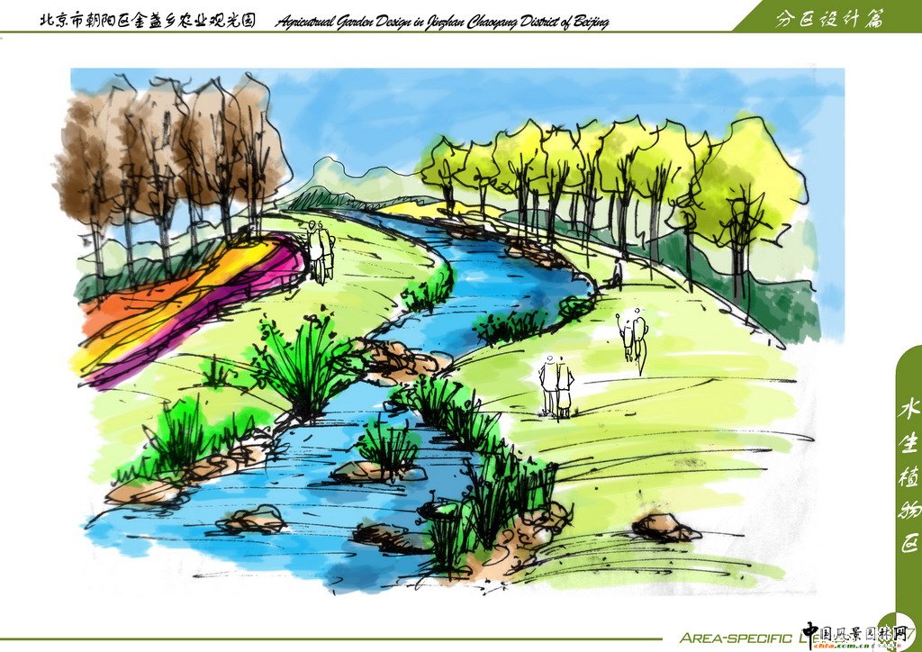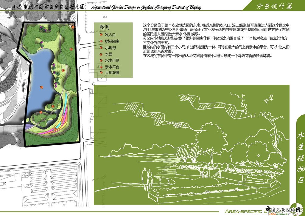 這個分區位于整個農業觀光園的東南,臨近東側的次入口,沿二級道路可直接進入到這個區之中,并且與果樹觀光區相互聯系,既保證了農業觀光園內的整體游線完整順暢,同時也方便了東側的居民進入園內散步 親水 休閑 娛樂。