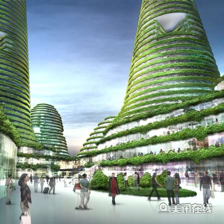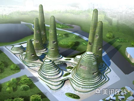 各個建筑的多樣性就是要求各自具有不同的程序、選址和規模,為了達到這樣的要求,設計師們將所有的建筑都設計為環形,通過將這些環形向外架構,每一層都設計了一個露臺。在層與層間安裝了水循環系統用來儲水和灌溉露臺上的植物,這些山狀建筑的樓頂和天臺的圍合式籬笆墻里面種植了各種植物,形成一個易辨認的附屬花園。這些垂直花園改善了建筑的氣候條件和通風滬指那個框,降低了能源和水的消耗,因此,這些綠色的小山也就自然的形成了一種獨特的景觀。