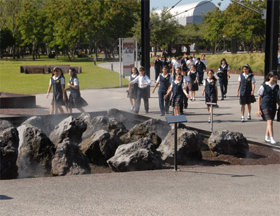 這里有兩個(gè)水景區(qū),它們同樣也是場(chǎng)地歷史敘述的一部分。在主廣場(chǎng),鋼板被做成階梯狀的瀑布,總長(zhǎng)200米,暗示著軌道車每天從這里運(yùn)走幾千噸的原材料,同時(shí)它也是花園與外界聯(lián)系的一個(gè)視覺(jué)通道。在博物館的入口處,是一個(gè)巖石與鐵礦石網(wǎng)格狀嵌入的噴霧狀噴泉,她告訴人們利用燒堿加熱提取礦石而產(chǎn)生大量蒸汽的過(guò)程。這個(gè)景觀對(duì)于來(lái)自于蒙特雷炎熱和干旱氣候的游客可謂是一大驚喜。