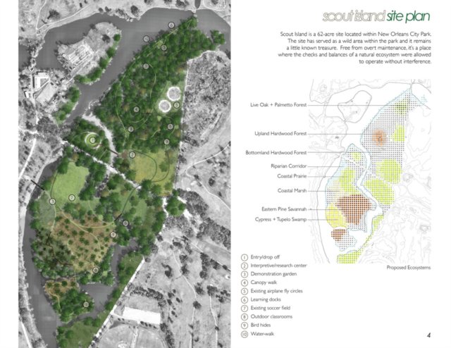 童子軍島是位于新奧爾良市中心的一個62英畝的城市公園,這里曾經是鳥類觀測和生態保護公園,但是2005年的卡特里娜颶風毀壞了這里的森林。在這次自然災害之后,這個項目著力于建立了一系列靈活的基礎設施,重建這里的生態系統,并提供一個教育,娛樂,文化交流場所。