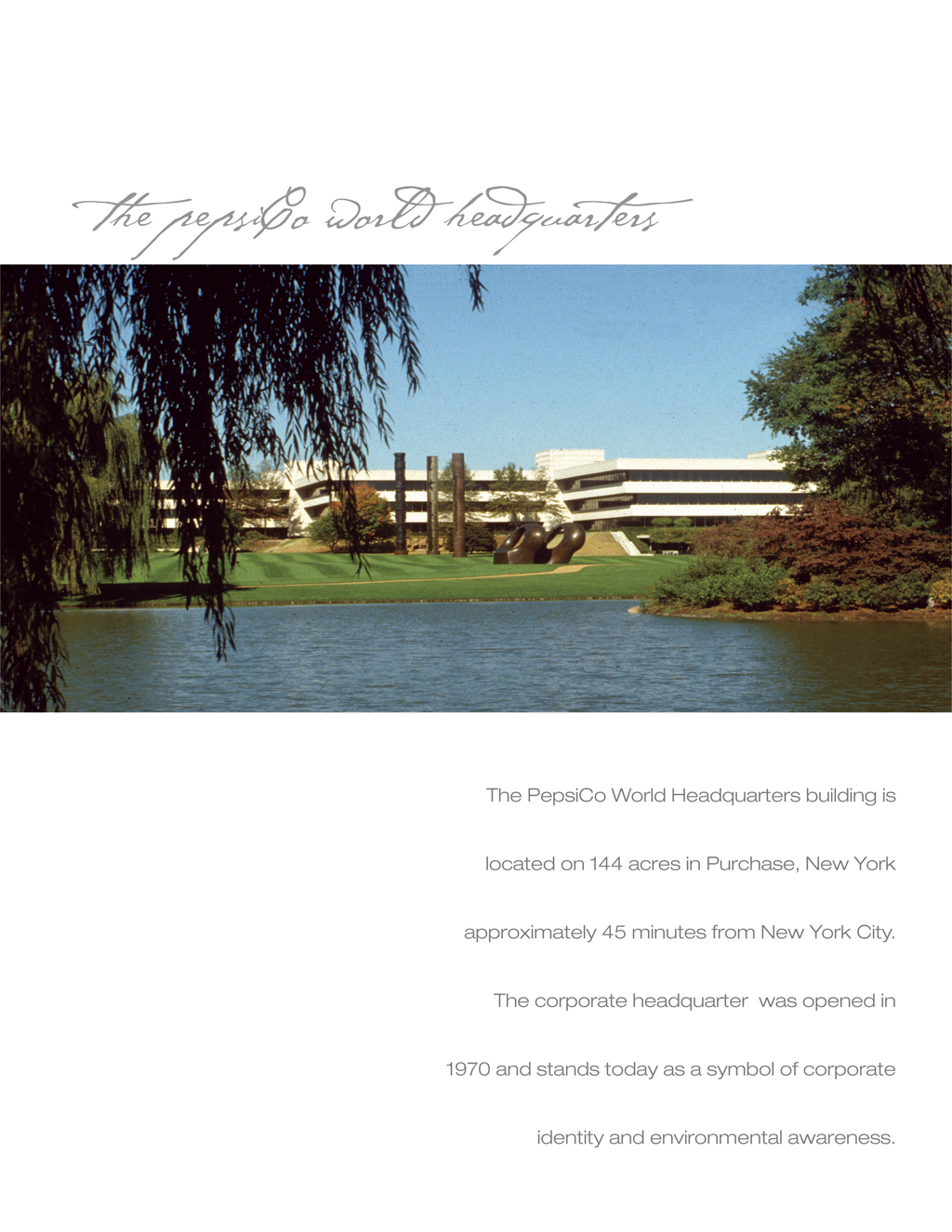紐約百事公司全球采購總部是一個將景觀,雕塑,花園,噴泉很好融合的例子,它不僅改善了公司的環境,而且提高了員工的工作態度,生活方式和整體表現。30年以來,百事公司的目標一直定位于培養優秀的員工和杰出的產品。直到今天公司依然努力實現著這個理想。