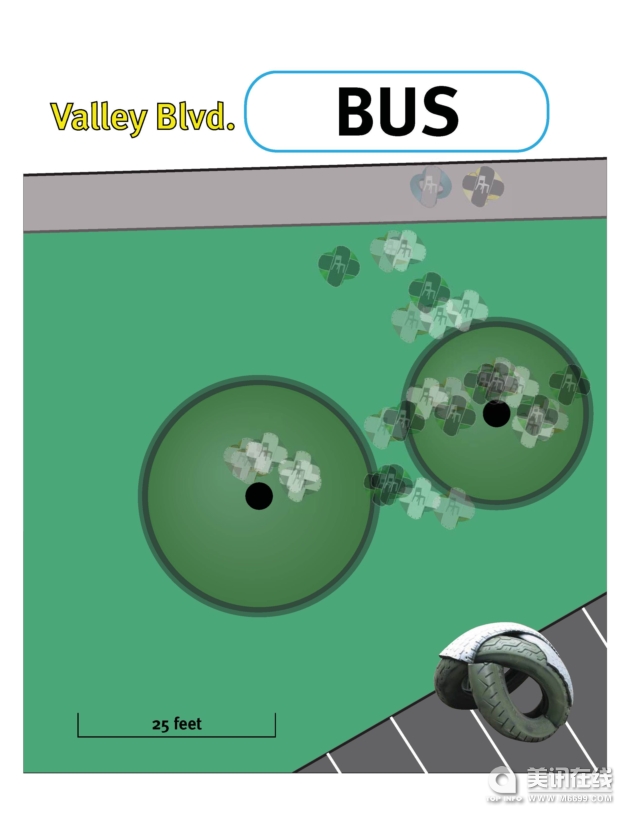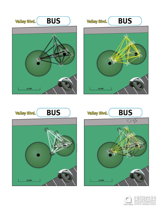 每個椅子的挪動都在一個特殊的三角區域內。三個點決定了這個區域:兩棵樹是兩個點,一個點接近人行道。