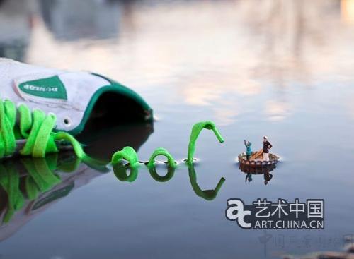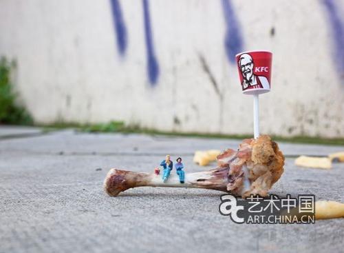在作品《奇妙的旅程》中,一個綠色的鞋帶成了龐然大物,它像是水中的一條巨蟒,對正在啤酒瓶蓋上航行的兩人構成了威脅。作品《骨頭》中,肯德基的炸雞骨頭上坐著兩個人,和炸雞相比,他們是渺小被動的消費者。