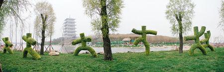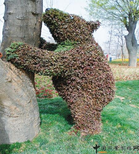 在本屆世園會上,有30多處主題各異的綠色植物造型,它們有大到夸張的蝸牛,憨厚戲耍的大笨熊,在風中舞動的6位練習太極的“掛面人兒”,還有鐘情于長安塔、比劃出一幅取景框的大手等,目前已有部分綠雕完成了施工。