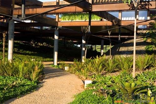 由于房屋懸空,在房屋下面種植蕨類,花卉甚至蔬菜,于是房屋就像三文治一樣,為屋頂植被和屋下花園這兩層綠色平面所包裹。
