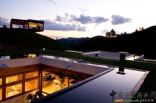 水面似鏡面一樣寧靜,構成了屋頂的一部分,這座由巴西建筑師事務所負責設計的別墅將概念設計演變成了現實。在屋頂有巨大的蓄水池,這些水渠最終都會納入這個蓄水池中。