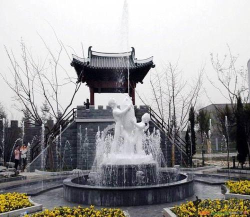 展園中央一座噴泉靈動活潑。噴泉中的一男一女兩個小孩抱著一條仰起頭的鯉魚,鯉魚仰頭向天空噴著水,兩個兒童眺望著遠方,臉上掛滿了幸福的微笑,似乎在對游人訴說生活的幸福與美好。