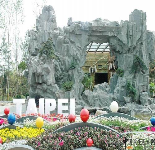 臺北展方負(fù)責(zé)人表示,假山代表臺北的雪山山脈,山洞前的水簾代表臺灣被水包圍,世界聞名的101大樓,遠(yuǎn)看是圓的,右邊的在西安隨處可見的銀杏樹葉也是圓的,中間有很多類似橋樣的裝飾還是圓的。而位于最中心的假山下的湖是心形的,圓的臺北與圓的西安組合在一起,代表著海峽兩岸用心期待團(tuán)團(tuán)圓圓的涵義。