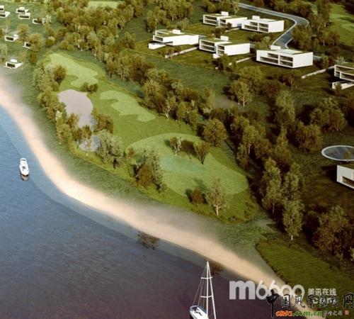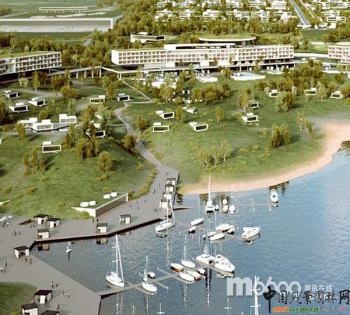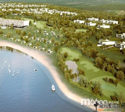 這項設計主要集中在景觀的設計,同時利用了地形的優勢,分成了幾個層次建造。處在第一層的是酒店、碼頭和部分靠近湖水的公寓。設計方案還有觀察平臺和外部休息區域,在這里可以清晰的觀察周圍的景觀,也加強了游客在這里的體驗。較高的一層要建造其他的設施,共管公寓穿過這個地區,和高爾夫球場平行,這就是周圍的景色更加迷人。