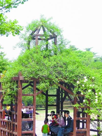 圖1:青島中山公園中木結構的涼亭爬滿了藤本植物,游人紛紛在此休閑納涼。