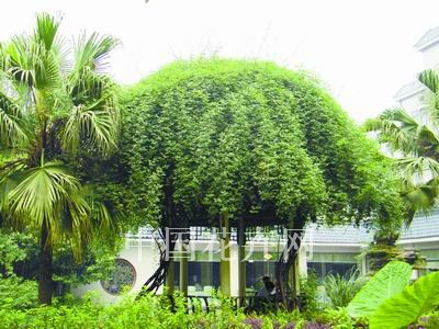 圖4:成都某處兩株七里香順著亭株攀援而上,茂密的葉子覆蓋了整個頂部,亭子顯得綠意盈盈。