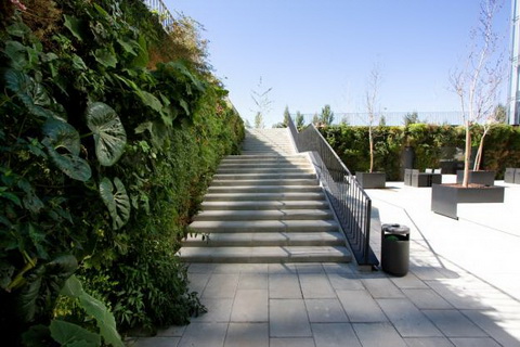 瑞典景觀設(shè)計(jì)師邁克爾海格瑞設(shè)計(jì)的垂直花園,采用了大約300種植物。這張照片顯示的這面墻(共三面墻)陽光照射最少,設(shè)計(jì)者采用了鐵角蕨、鳳尾蕨等蕨類植物,秋海棠屬,冷水花屬等闊葉植物和日本鳶尾和吊蘭類狹葉植物等耐蔭植物。