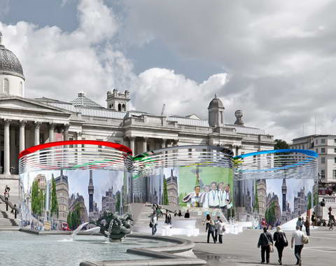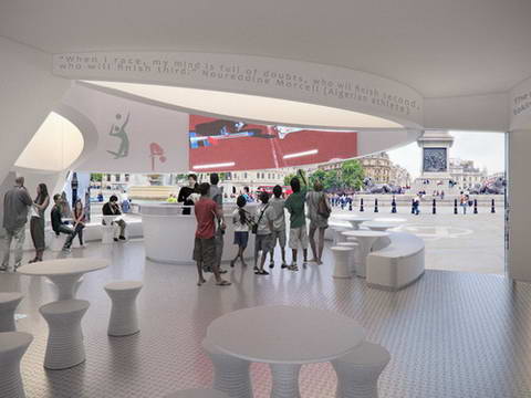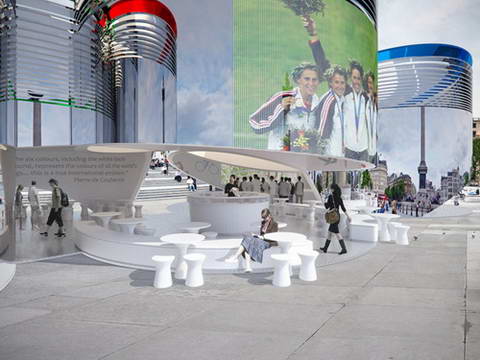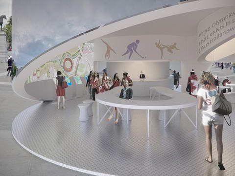 葡萄牙建筑師 jose carlos cruz、ines guedes、miguel santos和antonio cruz設(shè)計(jì)的方案贏得了[AC-CA]2012年倫敦奧運(yùn)會(huì)信息館的設(shè)計(jì)競(jìng)賽。這個(gè)標(biāo)志性的場(chǎng)館位于倫敦特拉法加廣場(chǎng)。藍(lán)色、黃色、黑色、綠色、紅色和白色的圓環(huán)向人群傾斜,讓過往的參觀者可以看到場(chǎng)館內(nèi)部,同時(shí)還擴(kuò)展了城市公共空間。環(huán)形建筑的部分邊緣升起,讓路過的人群可以進(jìn)到場(chǎng)館內(nèi)部。參觀者可以在這個(gè)奧運(yùn)五環(huán)空間中參觀、游覽,并在休息區(qū)享受周邊人流、建筑和噴泉等景色。五環(huán)建筑彎曲的鏡面表皮反射了廣場(chǎng)周邊的景色,為前來參觀的人群提供了一個(gè)完美的拍照背景,也為持續(xù)不斷的活動(dòng)和生氣勃勃的慶典提供了非常契合的平臺(tái)。在場(chǎng)館內(nèi)部,觸摸屏幕和互動(dòng)式地圖為人們提供必要的信息,內(nèi)部電力均來自屋頂上的太陽能光電板。投射在室內(nèi)外墻面上的影像不斷更新,為參觀者放送精彩的視頻和節(jié)目。