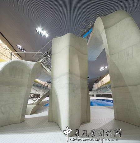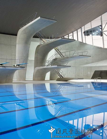 六個曲線型混凝土跳水板從大廳泳池的一端伸出,如同彎曲的舌頭一樣,彎曲的線條視覺上讓人聯(lián)想到起伏波浪,與頂上起伏的天花板交相呼應。