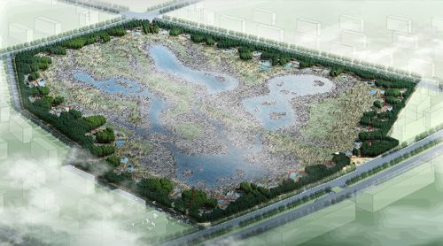設計策略是保留場地中部的大部分區域作為自然演替區,沿四周通過挖填方的平衡技術,創造出一系列深淺不一的水坑和高地不一的土丘,成為一條藍-綠項鏈,形成自然與城市之間的一層過濾膜和體驗界面。沿四周布置雨水進水管,收集城市雨水,使其經過水泡系統經沉淀和過濾后進入核心區的自然濕地山丘上密植白樺林,水泡中為鄉土水生和濕生植物群落。高架棧橋連接山丘,布道網絡穿越于丘林。水泡中設臨水平臺,丘林上有觀光亭塔之類。創造豐富多樣的體驗空間。