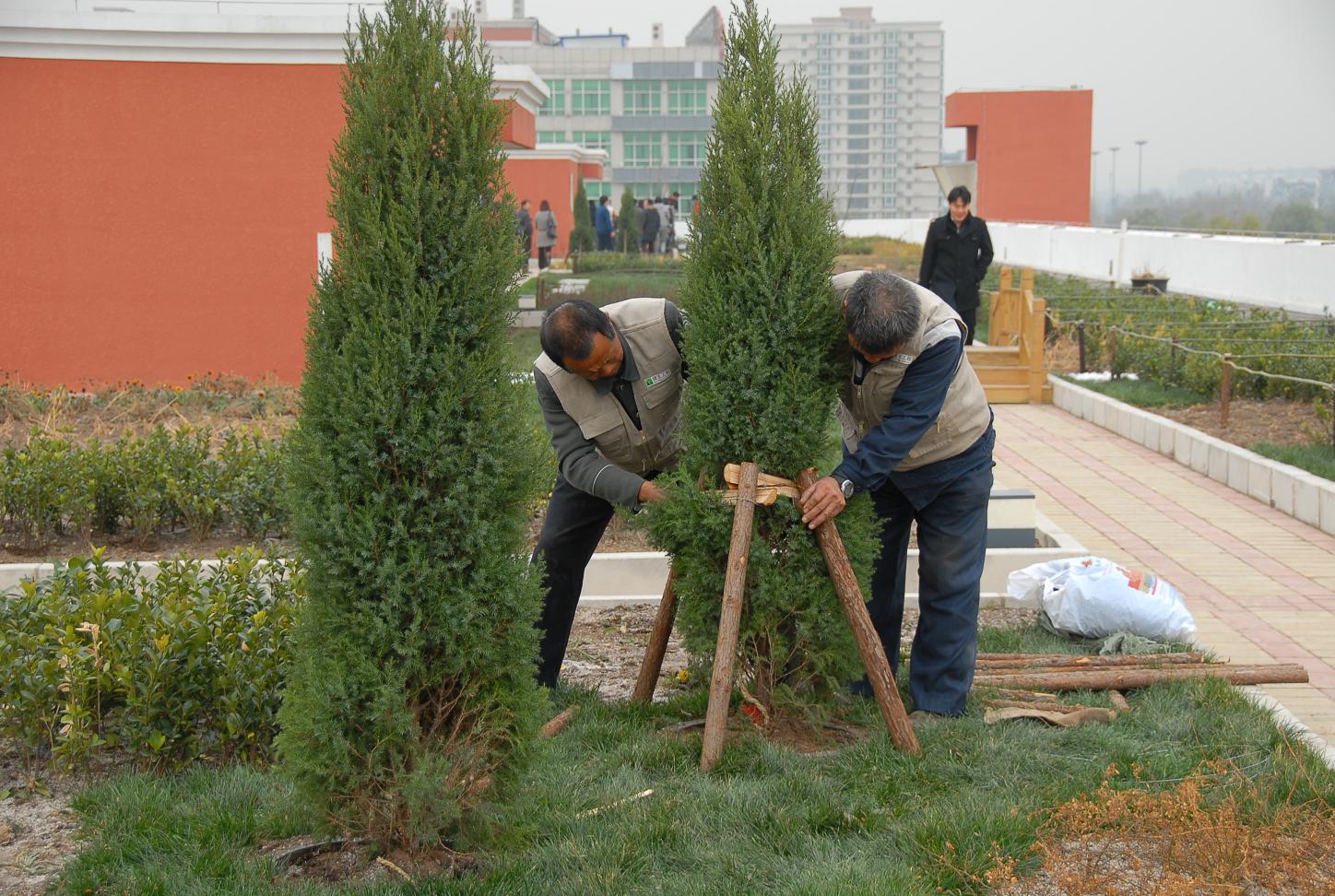 園林工人正在人大附小教學樓的屋頂公園養護樹木。(馬玉芹攝).