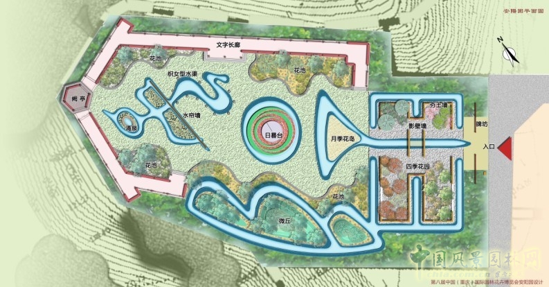 展園從東南方入口開始依次有四季花園、太陽花園和織女花園三大景區,此外還有一個文字長廊展示區以及用于合圍展園的外圍林帶。整個可分為中心景觀軸和合圍邊界兩大部分。