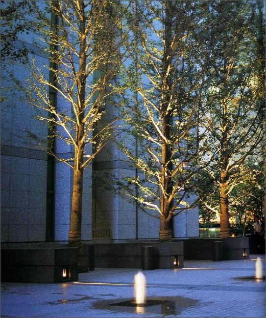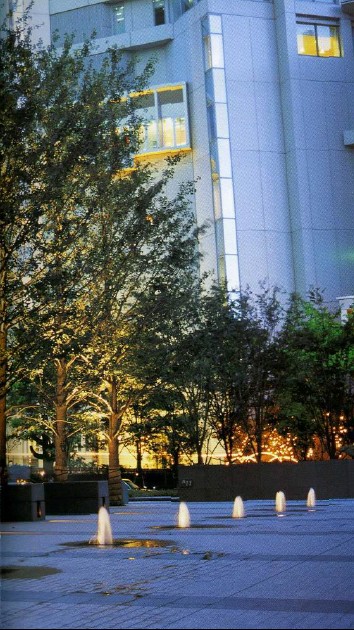 傍晚時分,噴泉展現著另一番美感,反射著燈光像是閃爍的星子,汩汩地使人情不自禁地幻想著有音樂緩緩流出。周圍的樹木沉醉在這靜寂的光景中。