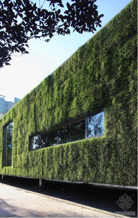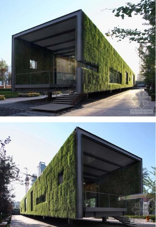 這個“懸浮的裝置”位于北京廣安門地區的高聳樓群之中,是為華潤置地廣安門項目銷售與生態展示所設計的一個使用期限約為三年的臨時性建筑。因此如何使該建筑迅速便捷的建成,在使用過程中和未來拆除后對現狀園區景觀影響最小,并體現“綠色,生態”的銷售主題,成為整個設計的前提。整個建筑像一個臨時“裝置”,以輕盈的姿態懸浮于現狀景觀廣場之上,旨在不與現狀紛雜的地段條件發生直接對接,化解“臨時”和“永久”的矛盾。綠色的生態草板表皮將體量融入到周圍景觀樹陣環境之中,同時強化了售樓處綠色體驗,對建筑的生態可持續性做出了獨特的嘗試與詮釋。