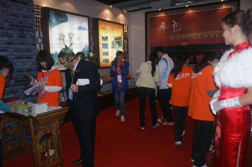 南充室內(nèi)展館,用青磚、碧瓦、窗花、門匾、燈籠等元素構(gòu)成的仿古民居和古式條案、圈椅等古典家具為載體,正面以一幅暗紅色基調(diào)大型嘉陵江朝霞圖突顯出主題:"南充-嘉陵江畔最美的記憶",兩邊墻上以4幅帶仿古窗格的大型燈箱形象宣傳畫,重點(diǎn)宣傳了我市4條特色精品自駕游線路,即:探尋風(fēng)水文化之謎(凌云山景區(qū)、閬中古城景區(qū)、閬中天宮院景區(qū)、儀隴朱德故里);領(lǐng)略將帥故里之韻(張瀾o羅瑞卿故里、朱德故里);體驗(yàn)休閑浪漫之情(西山風(fēng)景區(qū)、嘉陵第一桑梓旅游區(qū)、升鐘湖景區(qū));品味三國文化之源(西山風(fēng)景區(qū)萬卷樓、閬中古城張飛廟)。其下的展柜上,展示了南充9縣(市、區(qū))的特色旅游紀(jì)念品和特色旅游商品,有絲綢類、樹皮畫等特色手工藝類、醋飲和桑葉茶等保健產(chǎn)品類、兔肉干和菌姑姑等特色小食品類。展柜和仿古條案上的重點(diǎn)旅游產(chǎn)品、精品旅游線路、特色旅游商品等各類宣傳資料,供游客自取。同時(shí),展位門口還有禮儀人員著旗袍、佩"南充歡迎您"綬帶,笑容滿面地向過往客人發(fā)放宣傳資料。南充展位是少數(shù)幾個(gè)集中宣傳旅游的展位之一,特色鮮明,資料豐富。