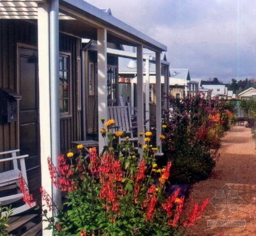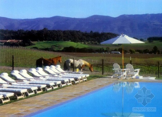 有別于加州納帕地區其他的旅游勝地,卡諾斯度假旅館的設計并沒有效仿歐洲南部建筑的設計風格,而是以本土景觀為主。設計師將富有加州北部特色的葡萄園、馬場和牛奶場等景觀融入到設計當中,使卡諾斯度假旅館呈現出典型的加州北部的農業景觀和設計特色。此地原來是一個廢棄的汽車旅館的停車場。蓄水池位于場地的最高處,此處是觀賞四周迷人的鄉村景觀的最佳場所。設計者在這片29,503平方米的場地上進行了全新的構建,使這片廢地煥發出全新的光彩。為了讓來此度假的旅客充分享受舒適、自在的私人空間,設計師將原來的汽車旅館改建成了一個個別墅和客房。場地內還修建了其他輔助設施,包括客房登記處、溫泉池、健身俱樂部、私人餐廳、公共酒吧、咖啡廳和用于廢水處理和;爭化的房屋和植物群。正對附近公路的公共酒吧、咖啡廳和;爭化污水的房屋連同樹籬一同起到了良好的隔音作用,讓旅客能有一個相對安靜的居住環境。客房登記處、私人餐廳、游泳池、溫泉區和健身俱樂部則修建在場地的山頂處,在這些地方能欣賞到怡人的鄉村景觀。同時這些位于山頂的建筑被巧妙地布局在蓄水池的北面和西面,起到了擋風的作用,為卡諾斯旅館地帶營造出溫暖的氣候氛圍。