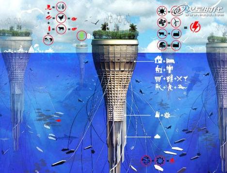 “水下刮刀”(Water-Scraper)就像“旋轉城”與澳大利亞“Syph”海洋城結合的產物,是一個水下倒立式摩天大樓,同時還運用了一些奇特的仿生學技術。來自馬來西亞的設計師薩利-安德烈-本-薩庫姆說,“其生物發光觸角為海洋動物群提供了生活和聚集之地,同時又能通過不斷運動收集能量。”