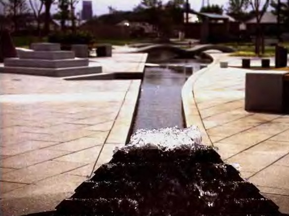 "光之廣場"做成每個人都可以自由出入并能防止意外的安全的下沉式草坪廣場。"發現之林"通過網格狀圖案的鋪裝和椊栽創造出空間的秩序。導入了具有多樣形態和色彩的點狀游具群。"相聚之泉"、"林中小溪"、"光之池"、"交流之潭"泉水在上停的流淌,最后形成水潭滲入地下。
