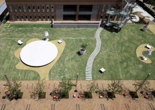 這是日本福岡市一個醫院及其配套學校的景觀設計。周邊被電視臺,圖書館,博物館,高層公寓,小學環繞。景觀設計師認為這個設計最重要的是“被認知的概念”,“服務設施”,“空白”。設計師也在此指導下進行了設計。