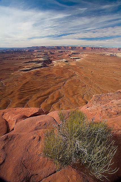 美國猶他州峽谷地國家公園,一株摩門茶(麻黃屬植物)生活在"綠河遠眺點"的巖縫中,俯視著下面的壯觀峽谷景色。摩門茶是一種擁有頑強生命力的灌木,早期的孟門教徒定居者將其制成一種飲品,既不是茶,也不是咖啡。很久之前,美洲原住民將其當成茶葉,治療胃腸疾病、感冒、發燒,甚至于頭疼。