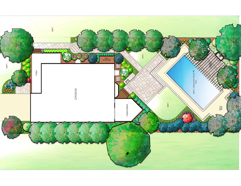下一個需要設計改造的項目是一個棚架式門廊。它也可能是太四四方方了,我們如何合理利用凸窗邊剩余空間呢?其他項目是壁爐、燒烤站、露臺餐廳,與水池毗鄰的遮光區、花園綠地和寵物玩耍的草坪。