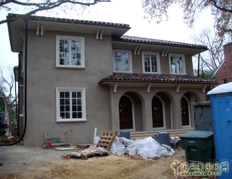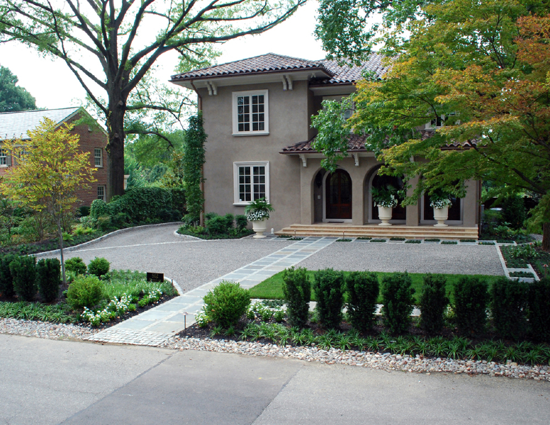 樓梯長廊盤旋猶如愛人的手臂,這里有足夠的空間容納4張躺椅和8個人用餐。游泳池靠著一條16英尺長的灰泥墻邊,墻頭倒掛著8英尺寬弧線傾斜的瀑布,可以從房中觀看到此景。完全完成修整的車庫添加了一道法式庫門,亦可做另一種功用——泳池別墅。橢圓草坪上樹籬設計遮住了車道的視線。兩株高大的寬幅刺槐樹冠為池塘遮陰,削弱了日光對車庫的照射。一株光葉櫸樹樹冠正對二層屋檐一角。多年生植物,一年生植物和草本植物布滿整個花園,郁郁蔥蔥,猶如一個調色板,讓整個花園充滿色彩感和地中海混搭式的紋理感。
