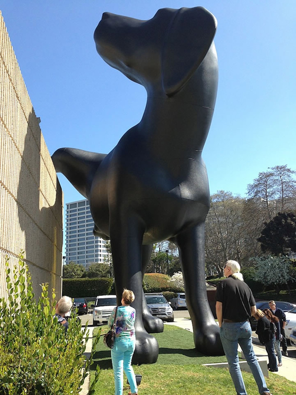 藝術(shù)家Richard Jackson近日在OCMA(Orange County Museum of Art,Newport Beach,California)的建筑物外做了一只撒尿的黑色拉布拉多獵犬(black labrador)雕塑。