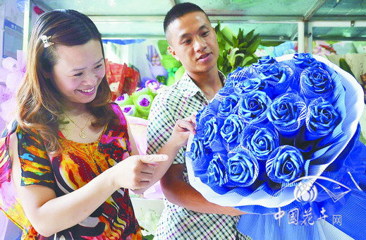 “七夕情人節(jié)”來臨,江蘇省東海縣的花農(nóng)和花店業(yè)主們已經(jīng)囤積了大量的各品種月季切花。‘藍(lán)色妖姬’的價(jià)格與往年相比最少漲價(jià)兩三成,同時(shí)也帶動(dòng)物流和快遞業(yè)務(wù)忙得不其樂乎,節(jié)日的“收成”頗豐。圖為消費(fèi)者正在花店選購‘藍(lán)色妖姬’。