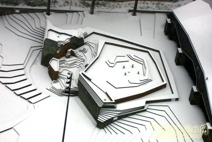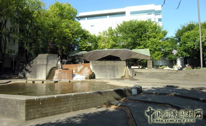中國風景園林網(wǎng) 哈普林最重要的作品是60年代為波特蘭市設計的一組廣場和綠地。三個廣場由一系列已建成的人行林蔭道來連接。愛悅廣場(Lovejoy Plaza)是這個系列的第一站,就如何廣場名稱的含義,是為公眾參與而設計的一個活潑而令人振奮的中心。廣場的噴泉吸引人們將自己淋濕,并進入其中而發(fā)掘到對瀑布的感覺。噴泉周圍是不規(guī)則的折線的臺地。