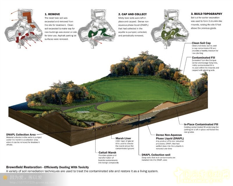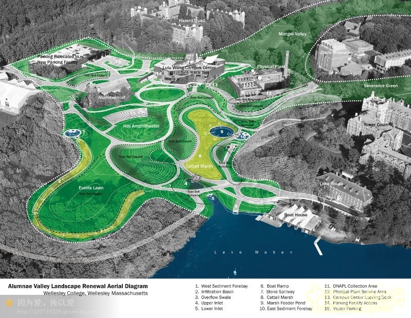 Alumnae Valley項目是將遭受污染的棕色土地轉(zhuǎn)變成綠色環(huán)保的典型景觀設計案例。Alumnae Valley景觀是MVVA公司對這個約5.5公頃的校園進行的長達7年改造的成果。經(jīng)過改善之后,再也見不到那被嚴重污染的場景,取而代之的是一個美麗的生態(tài)家園。