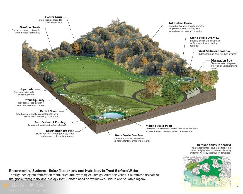 中國風景園林網(wǎng)訊 Alumnae Valley的改造被喻為”灰姑娘式”的規(guī)劃項目,因為她改造后宜人的生態(tài)景觀和山谷特色使衛(wèi)斯理學校從長期的、嚴重的污染環(huán)境中解脫出來,并成為學校環(huán)境景觀的一部分。這個由范·瓦爾肯伯事務所負責設計的項目,榮獲了2006年美國風景園林師協(xié)會(ASLA)的綜合設計杰出獎。范·瓦爾肯伯其所創(chuàng)建的MVVA事務所多年來佳作不斷,在ASLA獲獎作品非常之多,充分說明其作品有其獨到之處。其設計作品更多關注生態(tài)與環(huán)境本質(zhì)的東西,有時更讓人從中能領悟些什么,并不是那樣的平平淡淡景觀。
