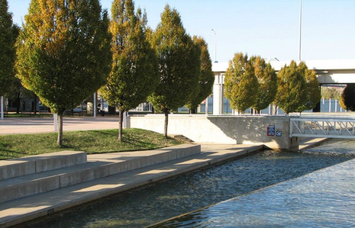 節(jié)慶廣場是一個略微傾斜的平面,起到連接城市和碼頭的作用,由于這里是公園最靠近城市的部分,因此設計成最具城市特色、可作為大型活動(如肯塔基州賽馬節(jié)、路易斯維爾市煙花節(jié)等)的場地。這個廣場用一種柔軟清涼的花崗石材料鋪設,另外,在鋪設時嵌入一系列通向河邊的混凝土帶,帶上設置節(jié)慶活動所需的彩旗和其他設施。節(jié)慶廣場的南部為入口廣場,并在其東部設置旱噴泉,作為附近線型噴泉水道的水源。