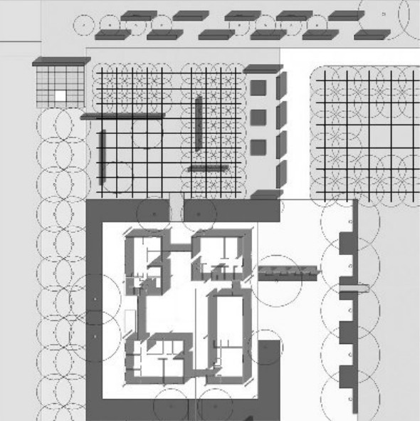 米勒花園中,建筑的墻體和柱子的模數定為0.762平方米。作為連接室內和室外的空間設計形式,丹·凱利則是3.05平方米的網格結構來種植樹木和綠籬。景觀的網格結構作為一個強有力的音符和建筑的形體相回應。