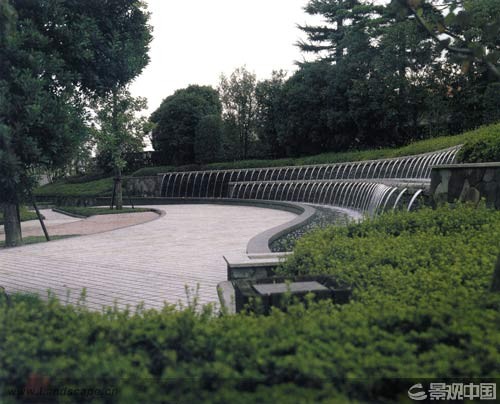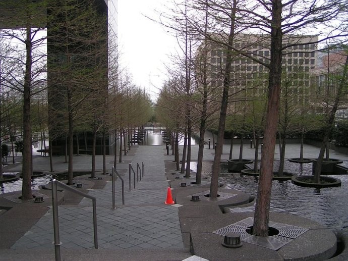噴泉廣場由三層不同結構組成:第一層結構是地面上五米見方的網格鋪裝,在所有網格的交叉點上種植了220棵落羽杉(美國水松),落羽杉被種在直徑7英尺的圓形種植壇中,覆蓋了所有的水面。種植壇相互間隔15英尺(為了強化樹林的整體空間效果),落羽杉林與水面是相互獨立的,一個分散的灌溉系統負責給落羽杉林提供水分與養分。第二層結構是在鋪裝網格的每個中心位置設置噴泉,形成一個由263個噴泉組成的網格體系。最后,在廣場的中央區域,凱利用十字交叉的鋪裝紋路代替原來的網格節點,并將網格切割為一米見方的正方形,每個點上布置了共計160個噴嘴的旱噴泉,平時關閉時可作為公眾的場地。噴泉由電腦控制,可以噴出不同形狀水柱。
