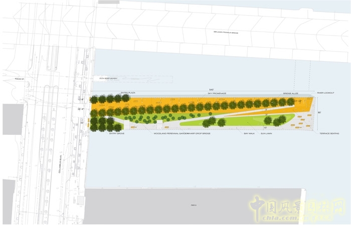 中國風(fēng)景園林網(wǎng)訊 Race Street碼頭公園位于費(fèi)城德拉瓦河(Delaware River)沿岸,由詹姆斯·科納field operations事務(wù)所進(jìn)行設(shè)計。德拉瓦海濱公司關(guān)于德拉瓦河濱水中心的建設(shè)有著宏偉的計劃,作為該計劃籌建的第一批公共空間之一,Race Street碼頭公園為游客創(chuàng)造出了一種強(qiáng)烈的身臨其境之感。它將河流與城市重新連接起來,活躍了濱水空間的氣氛,成為一個可供費(fèi)城居民休閑娛樂的新的公共空間。