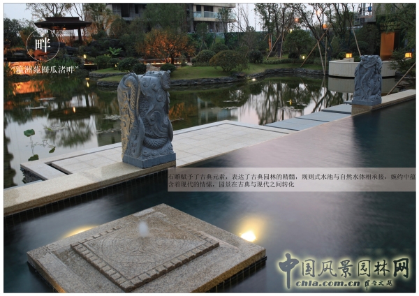 石雕賦予了古典元素,表達了古典園林的精髓,規則式水池與自然水體相承接,婉約中蘊含著現代的情愫,園景在古典與現代之間轉化。