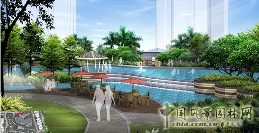 泳池與休閑平臺之間用活潑的跌水景觀進行巧妙的過渡和銜接,使得兩個空間相互滲透,饒有趣味。