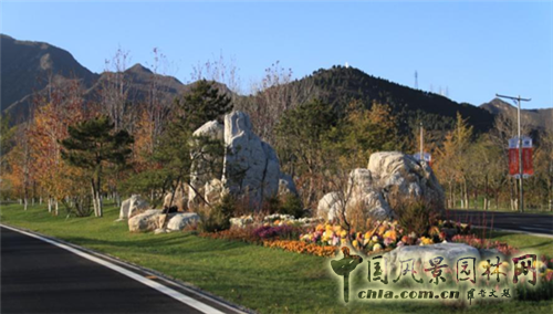 在大片整體山林的背景下,路口處我們做了一組山石點(diǎn)景。利用懷柔當(dāng)?shù)氐闹参铩⑹牡仍炀埃拐w景觀更具懷柔特色,更好的與周邊自然山水融合。從尺度變換的過(guò)程中文化是相同的,只是手法在改變。這也是一些石景效果的圖片。