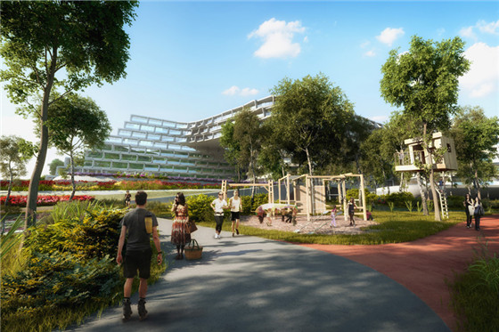從效果圖中我們也可以看到項目場地一側是八車道的高速公路,另一側是低密度的郊區住宅區,方案設計時也針對這種差別巨大的環境尋求了不同的對策。根據倡導熱情好客的“通過環境設計防范罪案指導原則(CPTED)”,星球城市住宅項目的公共空間為過路行人和周邊區域居民都提供了便捷,并且提升了社區的安全等級,同時促進了該項目與周邊城市環境的融合度。住宅樓外圍周邊的公共空間則融合到了日益繁榮的商業中心當中。