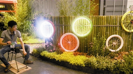 在一個(gè)由竹子拼成的墻上,掛著幾個(gè)大小不一的自行車廢舊輪胎,輪胎上被涂以不同的顏色。在工作人員的指引下,記者搖動了一個(gè)類似發(fā)電機(jī)的機(jī)器,墻上的輪胎竟亮了起來,并發(fā)出不同顏色的光環(huán)。來此參觀的范先生由衷贊嘆:“家里的墻上如果裝飾成這樣該有多漂亮,還能鍛煉身體!”